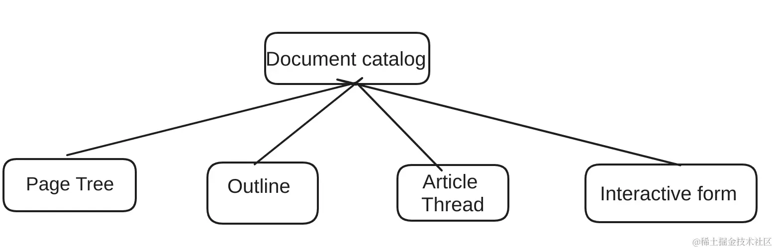Document Catalog 是 PDF 文档结构的根节点,这个根节点存在 trailer 中的 Root 里。从 Document Catalog 我们可以得到 PageTree 的根节点,然后解析 PageTree 解可以知道每一页的内容。Outline 等其他信息也是类似的流程。
