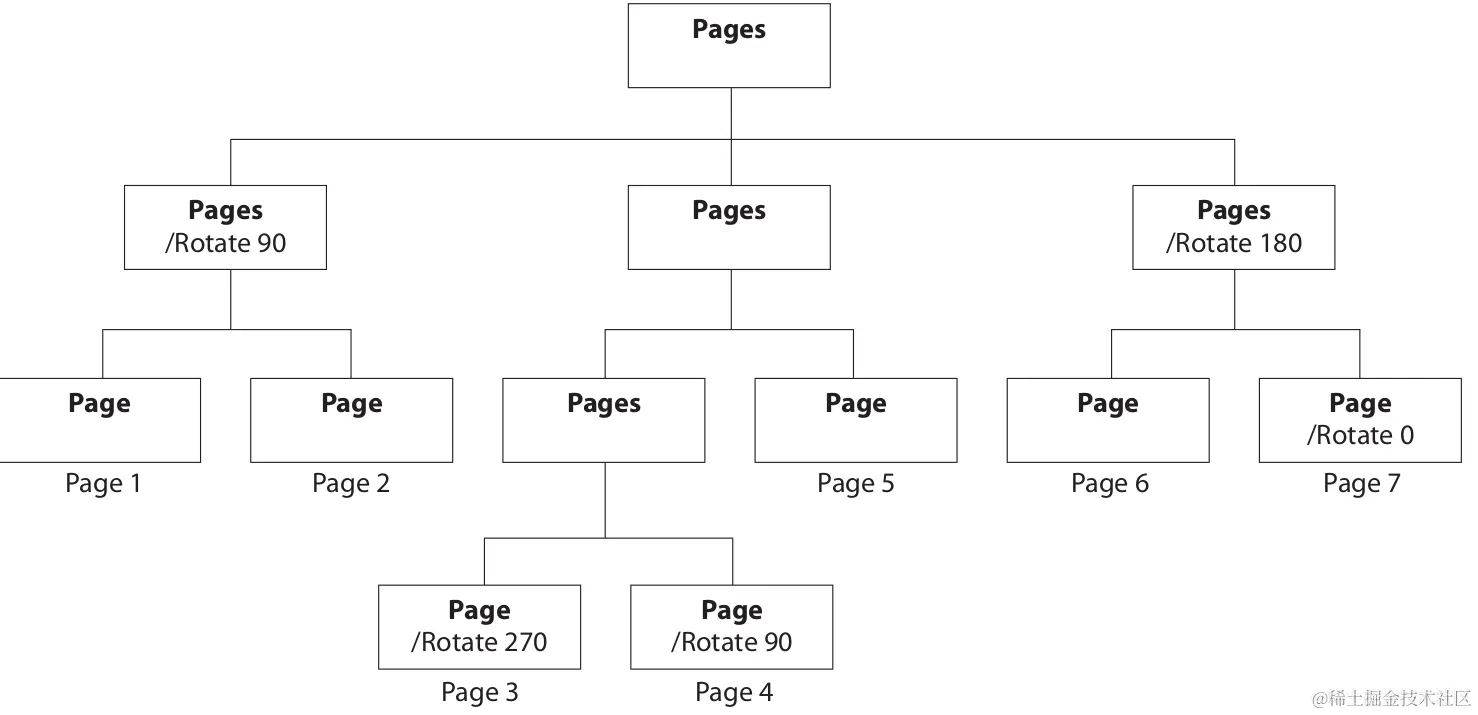 PDF 中的每一页都是一个Dictionary 来描述,这个 Dictionary 有 Page 中内容对象的引用,这一页上的注解,页面大小等等都可以在这个 Dictionary 中描述,所有的页都是 Page Tree 中的叶子节点,也有非页节点,而且叶子节点可以从父节点继承一些属性。比如页面大小。