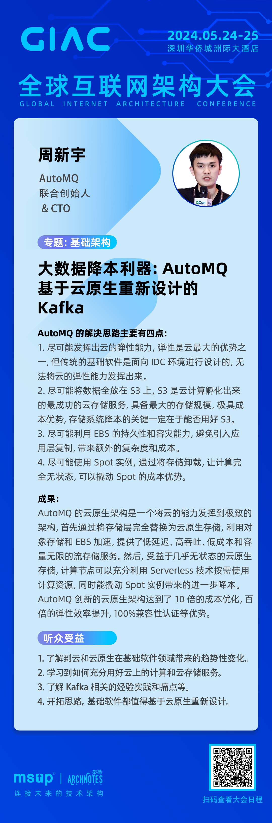 在本次大会的「基础架构」专题中,AutoMQ 联合创始人 & CTO 周新宇受邀参加本次大会,将与大家分享**《大数据降本利器:AutoMQ 基于云原生重新设计的 Kafka》**的主题演讲。
