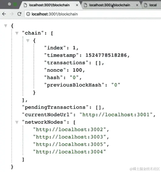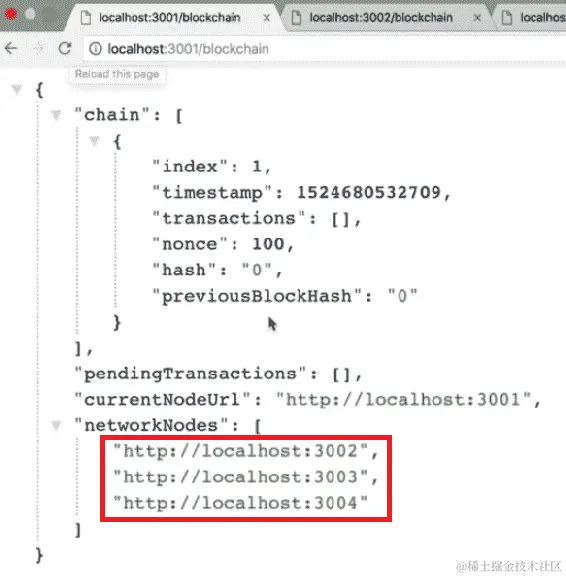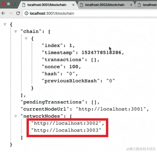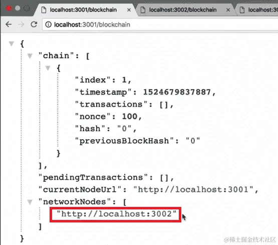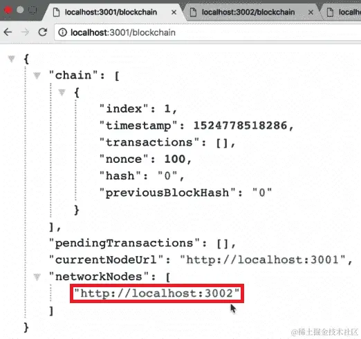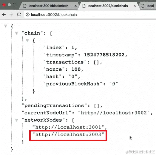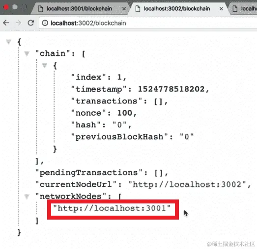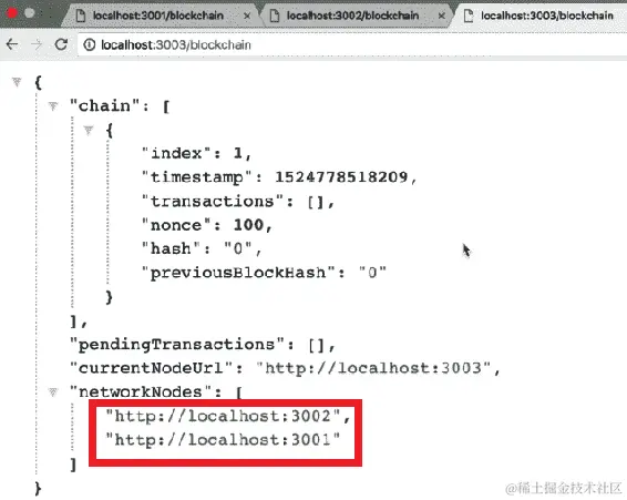从前面的屏幕截图中,我们可以看到我们的第三个节点现在也在localhost:3002的networkNodes数组中。此外,如果我们转到localhost:3003上的networkNodes并刷新页面,我们应该在networkNodes数组中有3001和3002:
