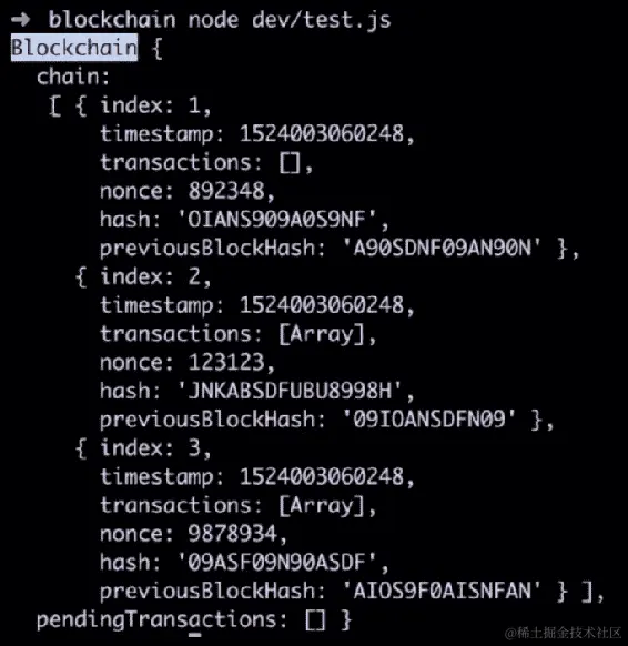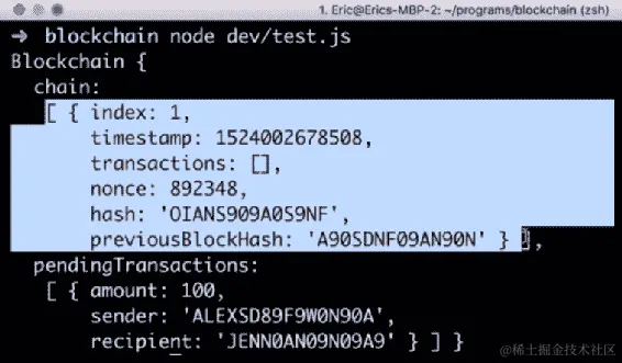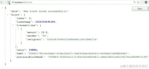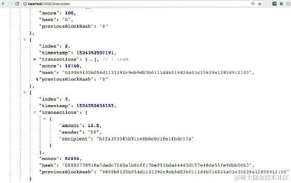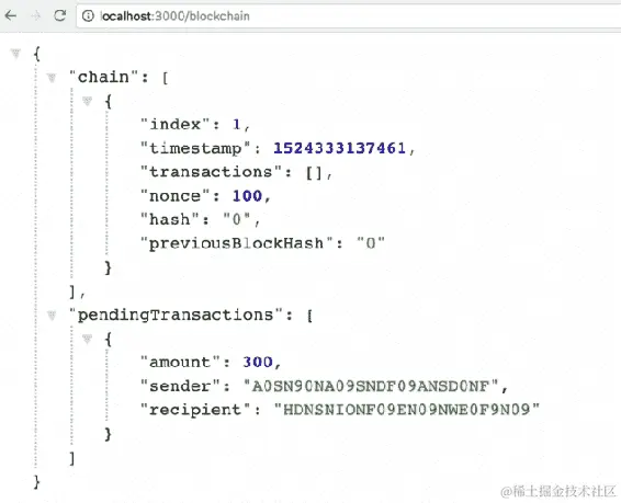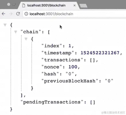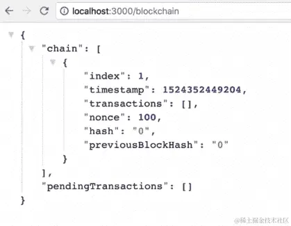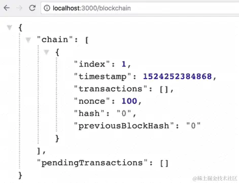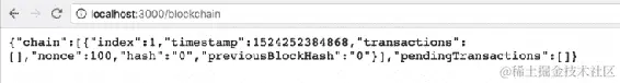 localhost:3001/blockchain到地址栏,然后按Enter。您将看到类似于以下截图所示的输出: