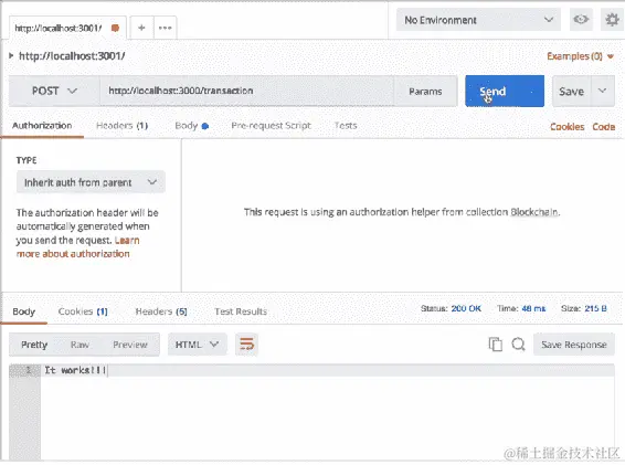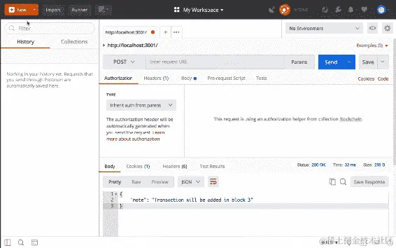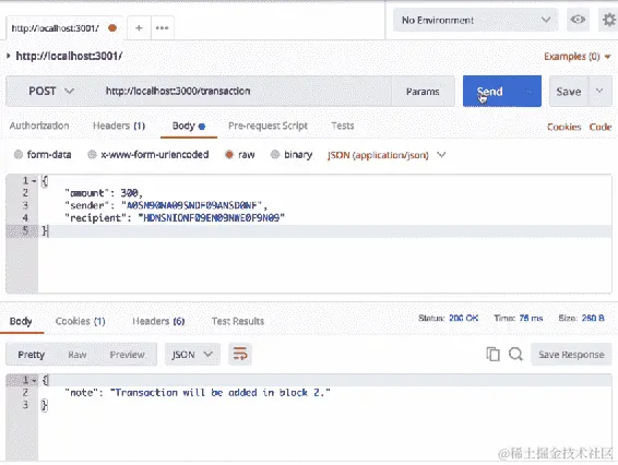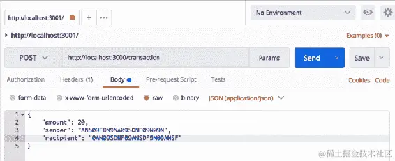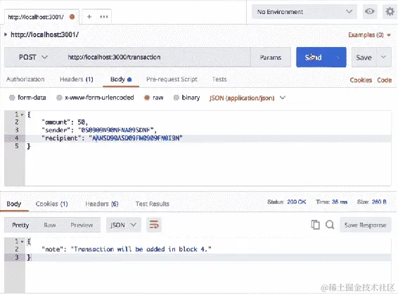 接下来,让我们向这个网络添加另一个节点。让我们回到 Postman,并将localhost:3002更改为localhost:3003。我们将向在3001上的节点发出请求: