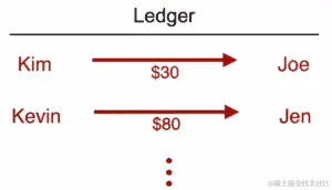让我们看下面的示例,以更好地理解分类帐。在这个例子中,Kim 支付给 Joe 30 美元,Kevin 支付给 Jen 80 美元。分类帐只是用来跟踪这些交易的文件。您可以在以下截图中看到这一点: