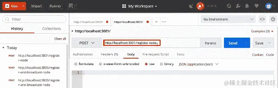 在 Postman 应用程序中,我们要发出一个 post 请求,以在localhost:3001上注册和广播节点。但在这之前,只需确保所有四个节点都在运行,以便我们可以测试路由。