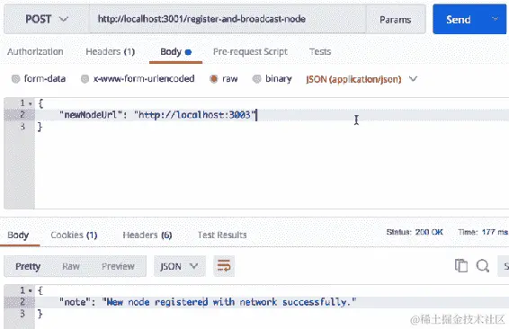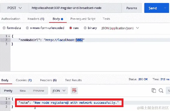 现在,当我们发出这个请求时,它应该将我们托管在localhost:3002上的节点注册到我们托管在localhost:3001上的节点。让我们通过单击“发送”按钮来验证这一点。您将看到类似于以下屏幕截图中显示的输出: