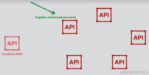 现在,您可能想知道所有这些是如何工作的。它之所以能够工作,是因为当我们发出"newNodeUrl": "http://localhost:3004"的请求时,我们实际上是在添加一个命令,将3004添加到网络中。但是localhost:3004如何在一次请求中意识到整个网络呢?