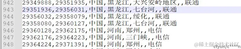 前面两列是起始ip和终止ip,后面是国家,省,市,组织,运营商