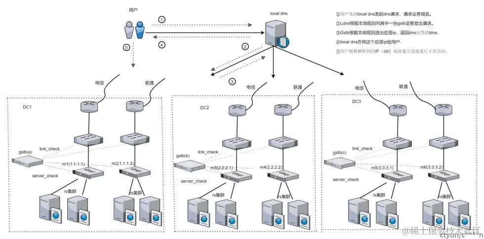 云业务容灾建设节奏一般是同城双活—异地双活—两地三中心(同城双活+异地多活),因为要解决的问题的复杂度和难度也是在逐步上升的,不可能一蹴而就。gslb可以实现两地三中心容灾,这时应用在多数据中心的情况下,业务需要分布式部署,无论哪个数据中心都可以独立承担业务,数据中心内通过服务器负载均衡(lb)进行数据中心内的业务负载,gslb是通过dns给lb做负载均衡,配合健康检查实现业务的故障切换,数据中心切换,一些算法如静态就近性可以就近访问加速等。