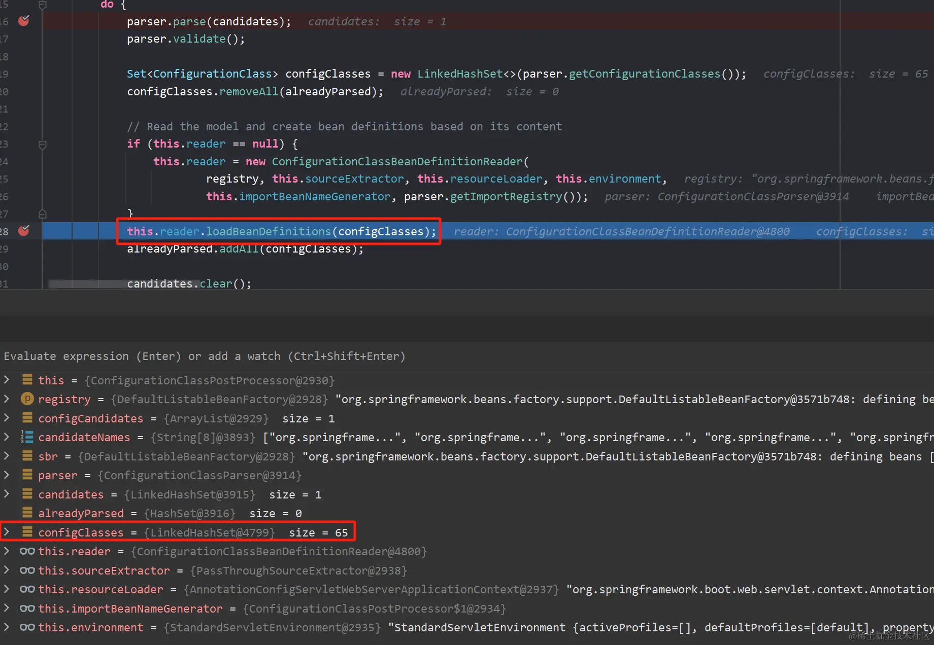 执行之前 this.reader.loadBeanDefinitions(configClasses);