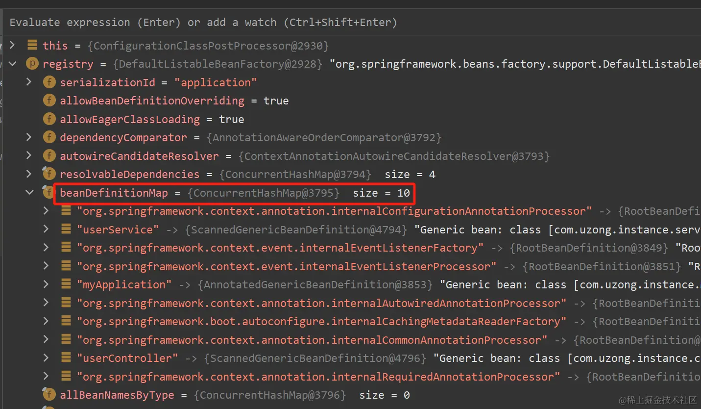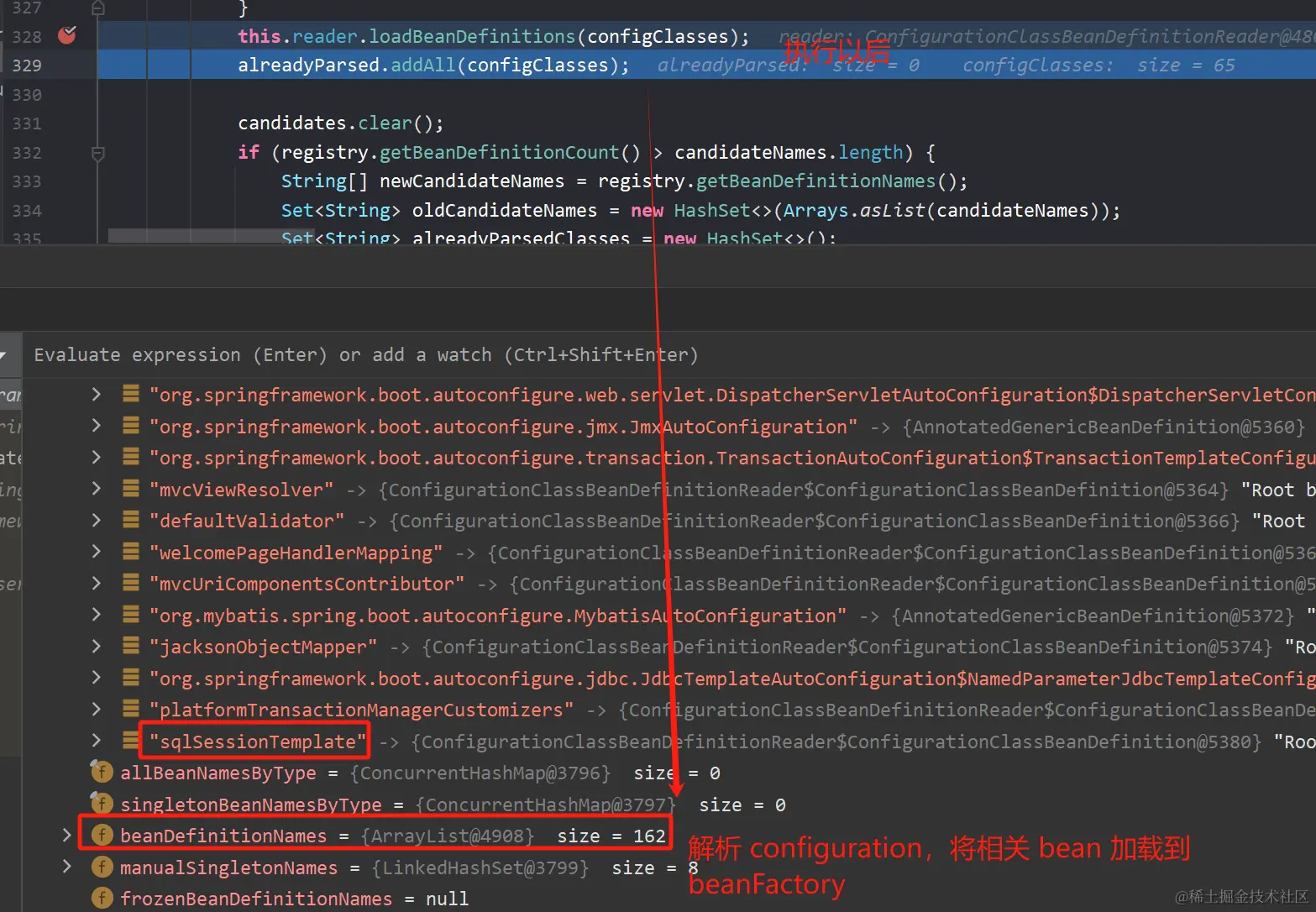 执行以后。 BeanDefinition 从 10 变成 162。将所有相关 configuration 中符合的 bean 都解析成 BeanDefinition,并放入到 DefaultListableBeanFactory