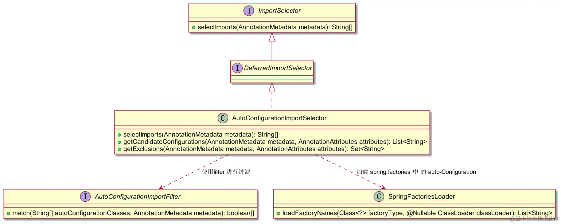AutoConfigurationImportSelector: 实现 ImportSelector 接口,负责读取spring.factories文件,并将符合条件的配置类名作为候选配置返回给Spring容器。