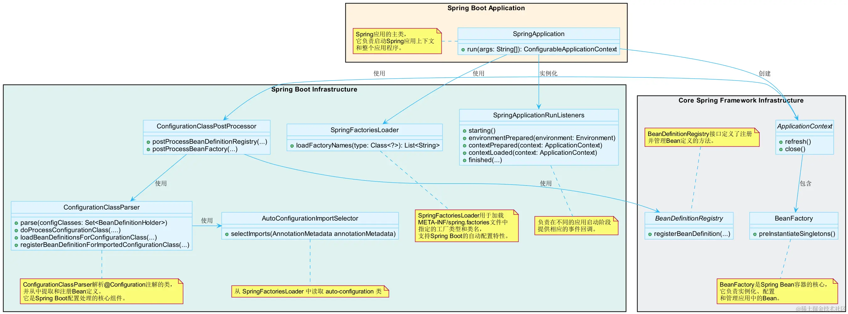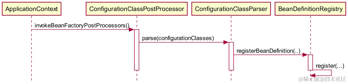 关键核心类: ConfigurationClassPostProcessor、ConfigurationClassParser、SpringFactoriesLoader、ConfigurationClassPostProcessor 等几个类;其他几个是 bean 的实例化。