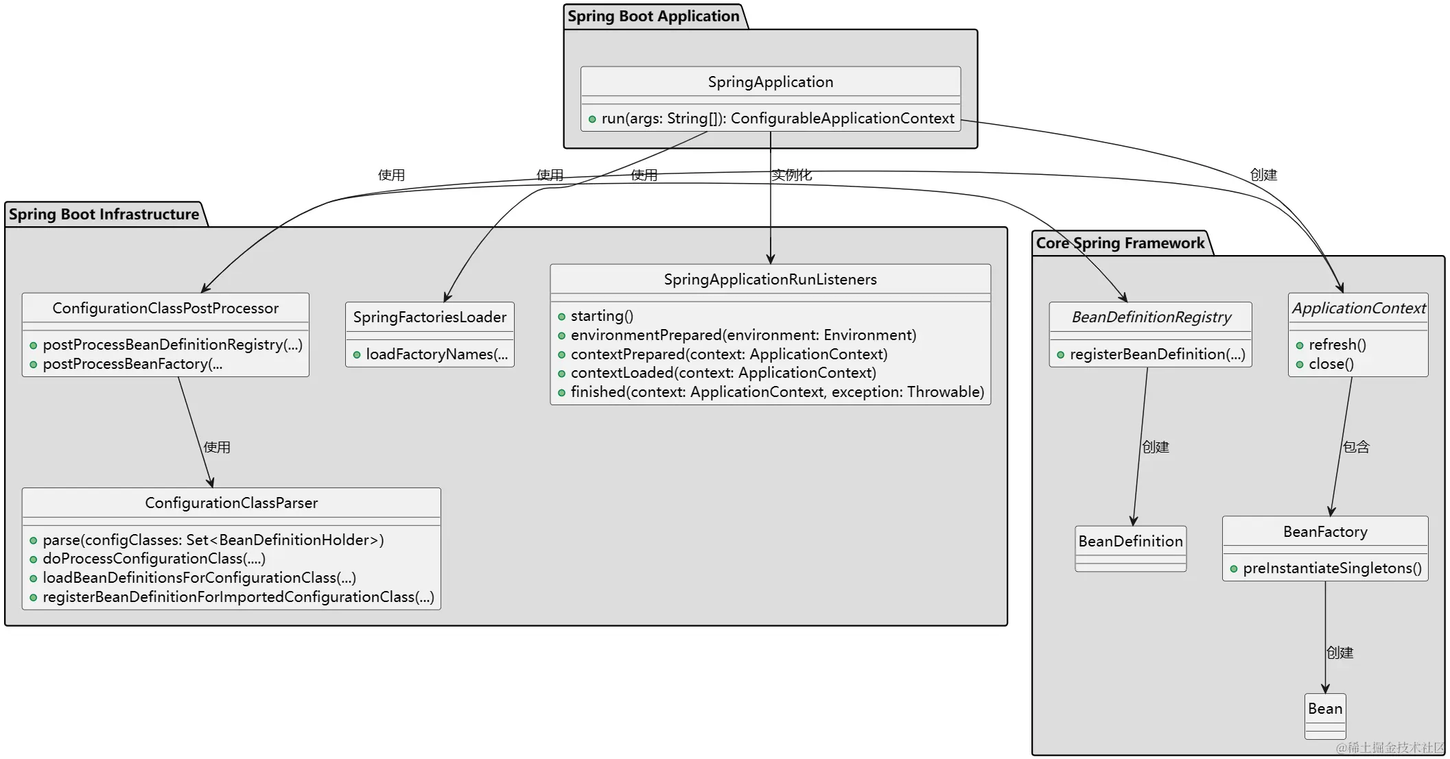 下图展示了 SpringBoot 启动过程高层次的组件图。 本文主要围绕图片中左边部分(SpringBoot加载过程)