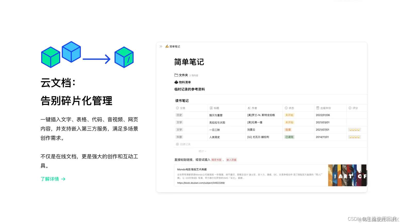 以云端笔记为载体,配合在线文档、知识库、文件夹等多形态功能,为个人和团队提供数字信息管理与协同的一站式工作中心,将我的日常碎片化知识整理到一起