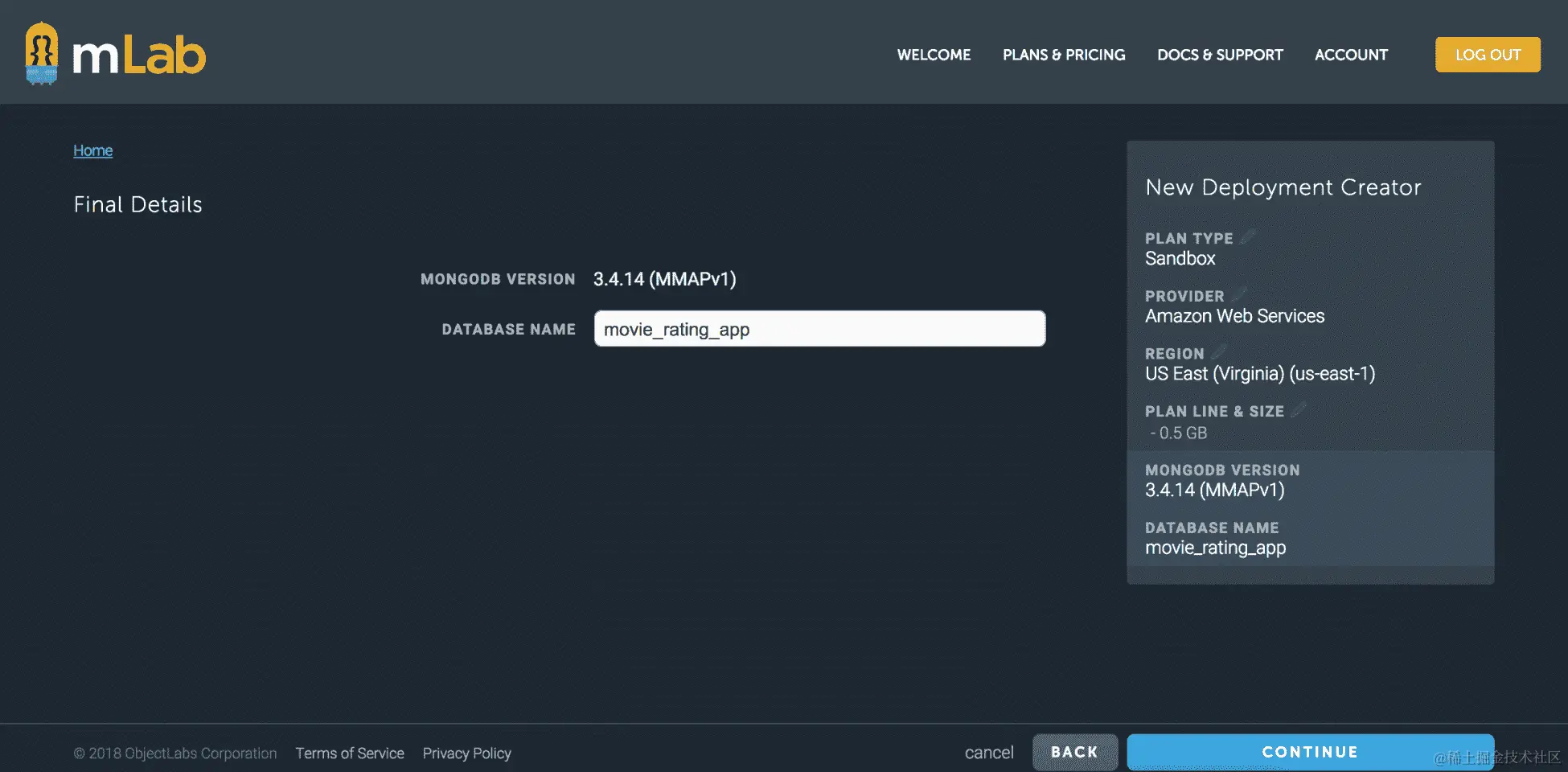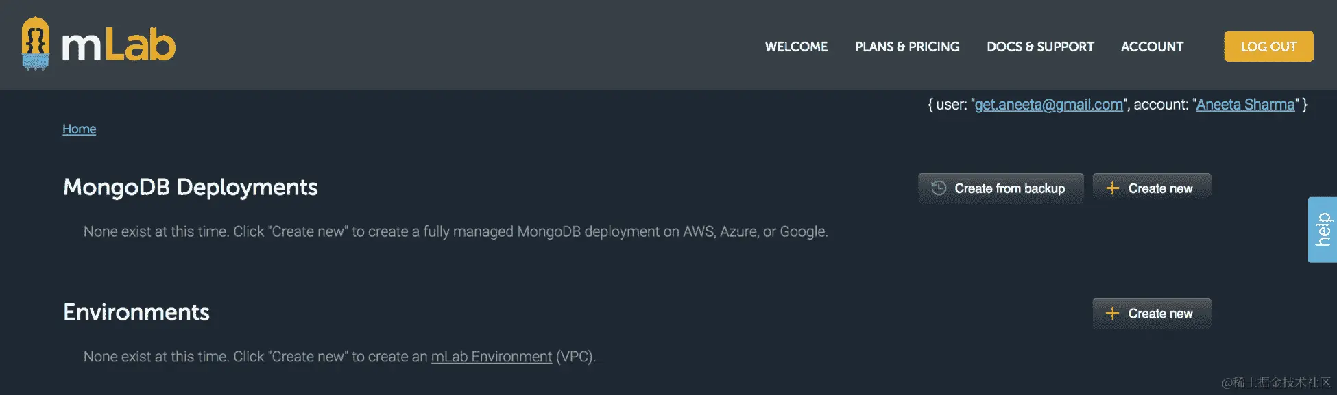 让我们继续在mlab.com/上创建一个帐户。一旦您登录,单击“创建新”按钮创建一个新数据库:
