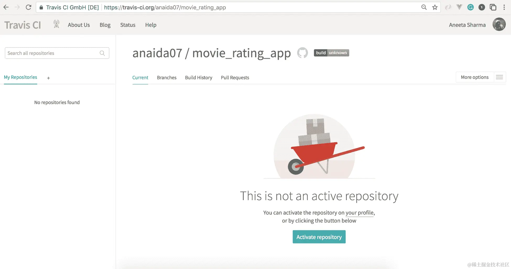 我们首先需要注册,可以使用 GitHub 登录轻松完成。完成后,您应该看到您现有的存储库列表。选择要设置 Travis CI 的应用程序,您将能够看到以下页面: