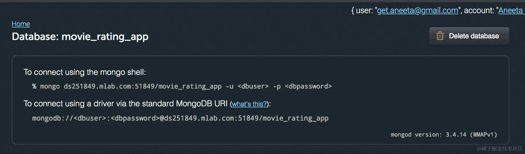 现在,如果我们单击数据库名称,我们可以看到 mLab 提供的 MongoDB URL 的链接。我们还需要创建一个数据库用户,以便能够对数据库进行身份验证。
