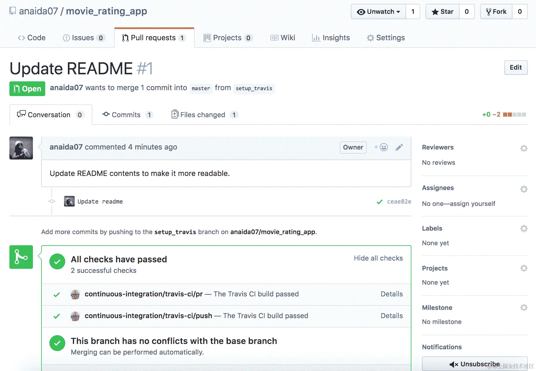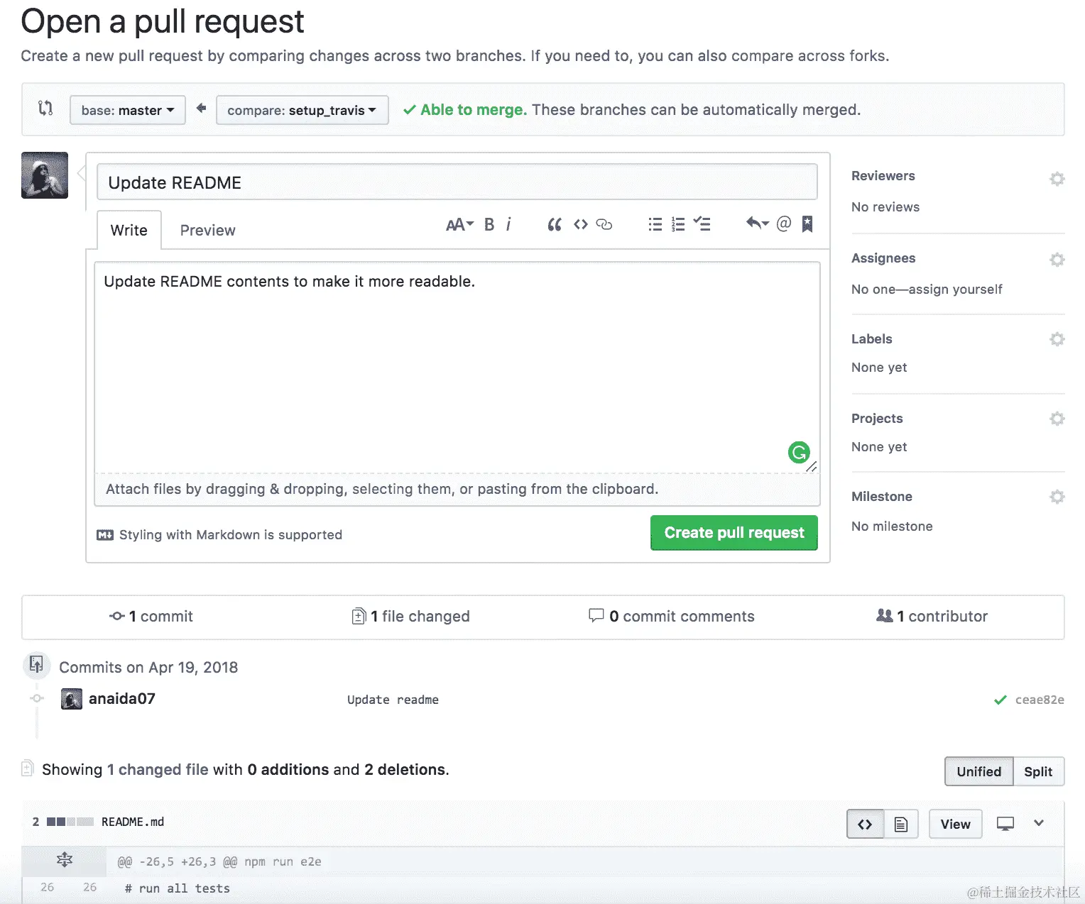 虽然这是查看构建的一个好方法,但最好的方法是为每个分支创建一个拉取请求,并在该拉取请求本身中查看构建是否通过或失败。因此,让我们创建一个新的拉取请求,以查看如何最好地利用 Travis CI 来使我们的生活更轻松。