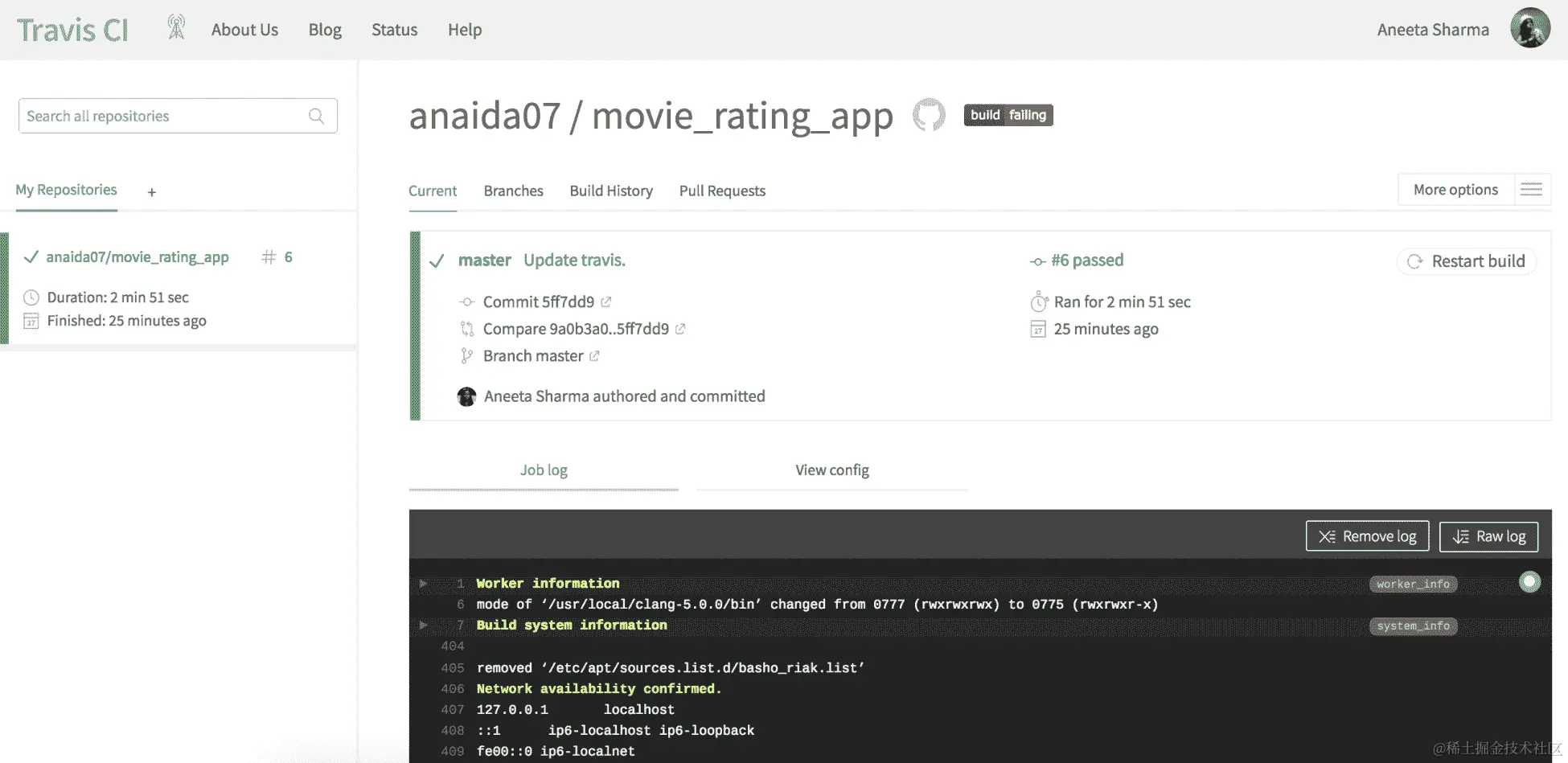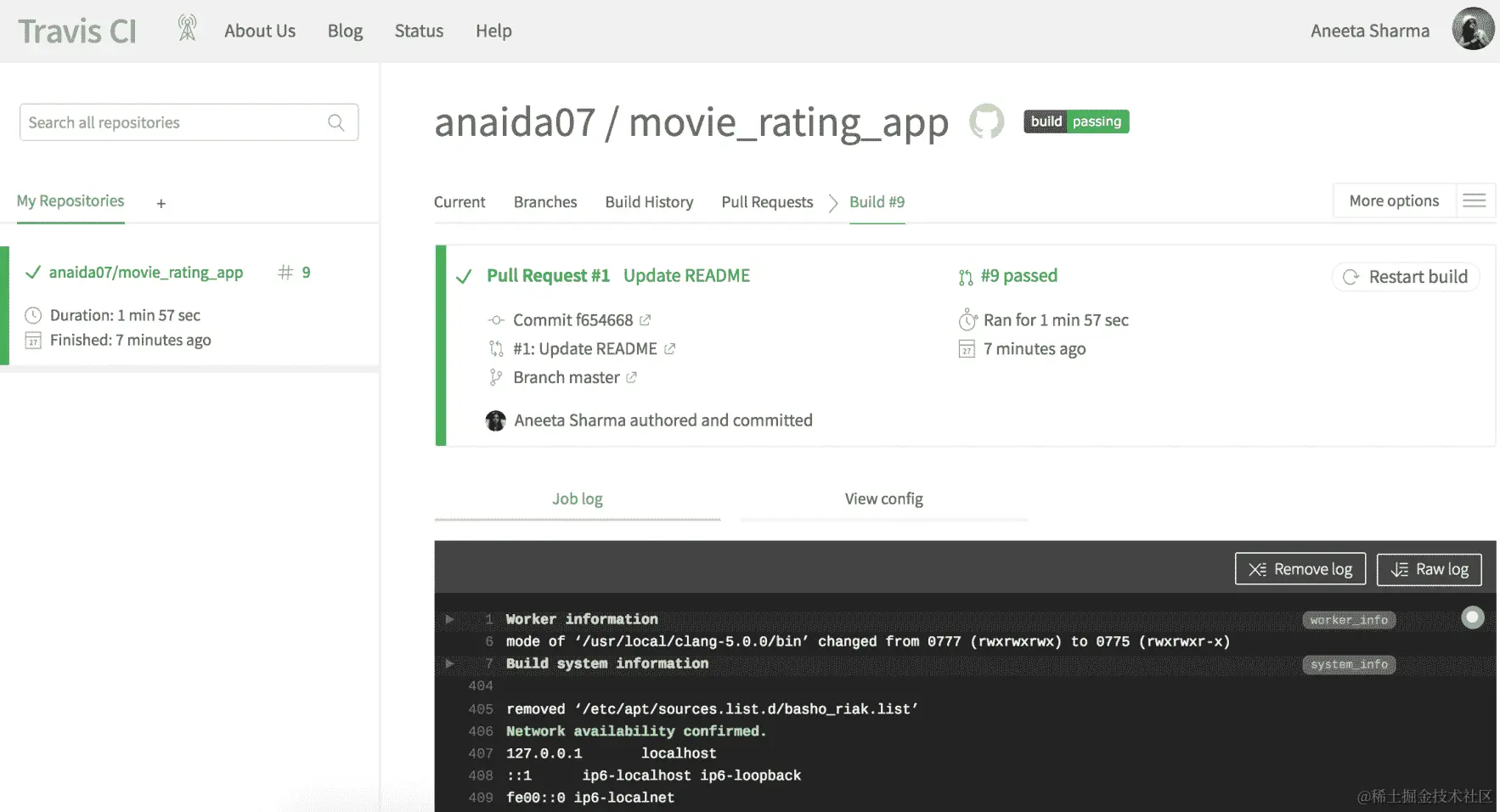 您可以在此处看到 Travis CI 已成功集成,并且测试也通过了: