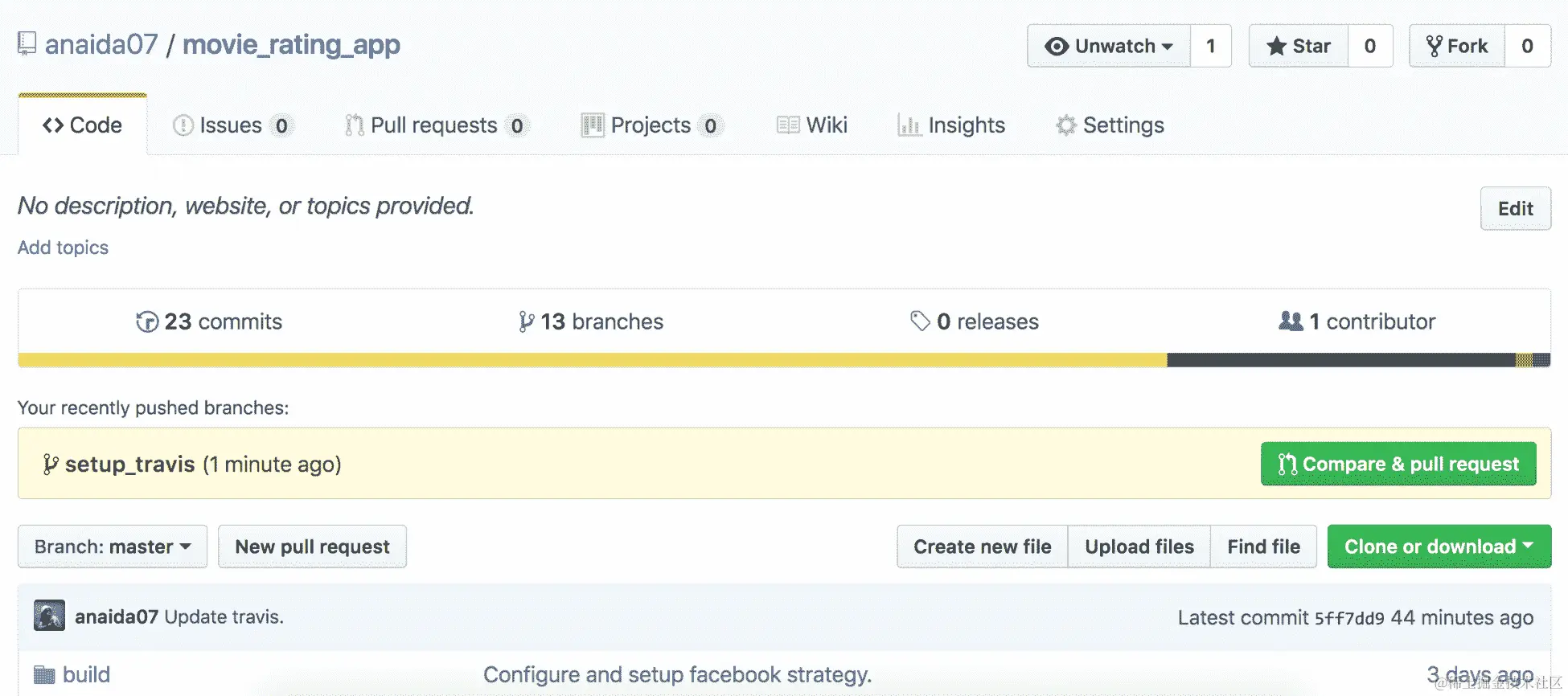 让我们创建一个名为setup_travis的分支(您可以为分支命名任何名称,但请确保它指示特定更改,以便更容易识别该分支可以期望的更改)使用以下命令: