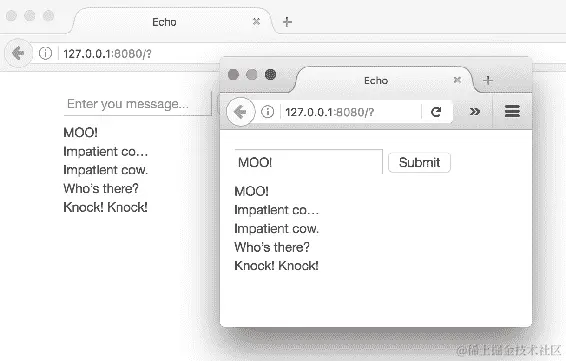 我们有一个静态原型,现在我们将使其功能。任何聊天都需要连接客户端之间的通信。通常,客户端不直接连接,而是通过服务器。服务器注册连接并转发消息。从客户端发送消息到服务器是很清楚的,但我们能否以相反的方式做呢?在过去,我们不得不处理长轮询技术。那样可以工作,但由于 HTTP 的开销,当我们需要低延迟的应用程序时,它并不是真正合适的。幸运的是,Electron 支持 WebSockets。通过该 API,我们可以在客户端和服务器之间建立全双工、双向的 TCP 连接。与 HTTP 相比,WebSockets 提供了更高的速度和效率。该技术可以将不必要的 HTTP 流量减少高达 500:1,并将延迟减少 3:1(bit.ly/2ptVzlk)。您可以在我的书JavaScript Unlocked中找到更多关于 WebSockets 的信息(www.packtpub.com/web-development/javascript-unlocked)。在这里,我们将通过一个小型演示简要了解该技术。我建议检查一个回声服务器和一个客户端。每当客户端向服务器发送文本时,服务器都会将其广播到所有连接的客户端。因此,在加载了客户端的每个页面上,我们都可以实时接收消息。