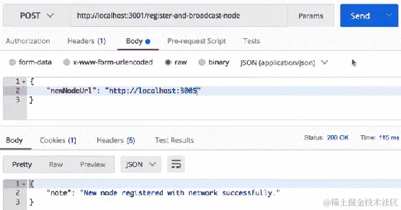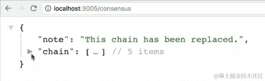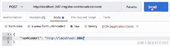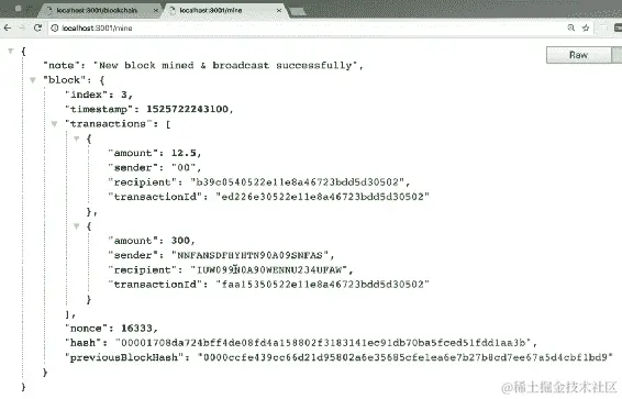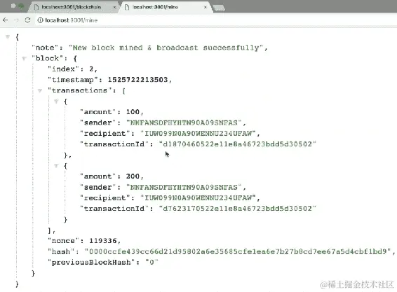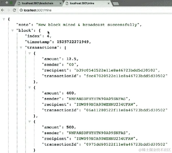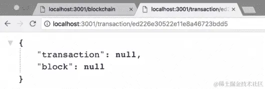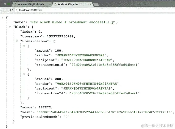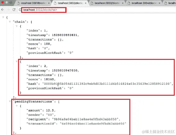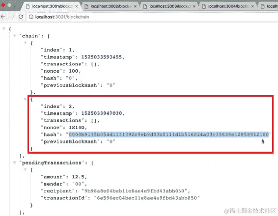 现在,转到任何其他节点并检查发送的交易。我们将无法在这些节点的pendingTransactions数组中查看交易。发送的示例交易只会出现在localhost:3001节点中。它不会广播到网络中的任何其他节点。