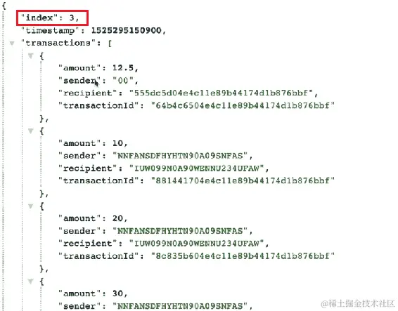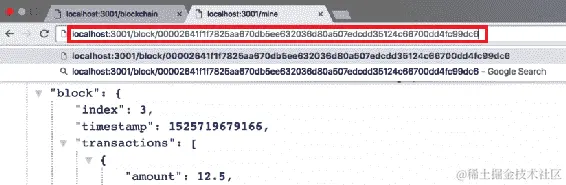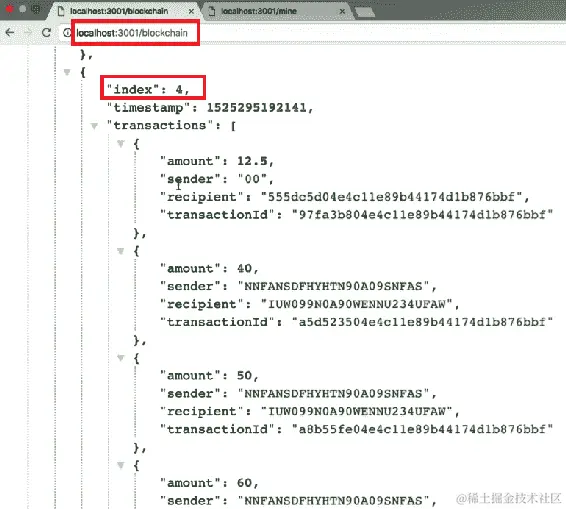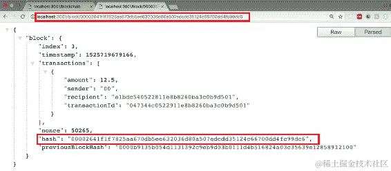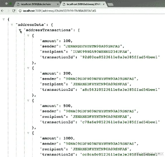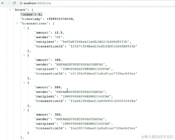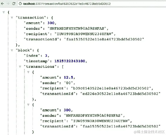 这基本上是区块浏览器的工作原理。我们输入我们正在寻找的哈希或数据片段,作为回报,我们得到该数据片段作为输出。从前面的屏幕截图中,我们可以观察到,我们输入到区块浏览器的哈希值返回了索引为4的区块。我们还得到了与该区块相关的所有细节。此外,您可能已经注意到,对于此搜索,我们正在命中/block/:blockHash端点。