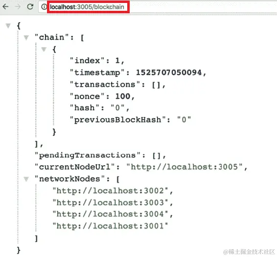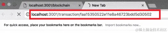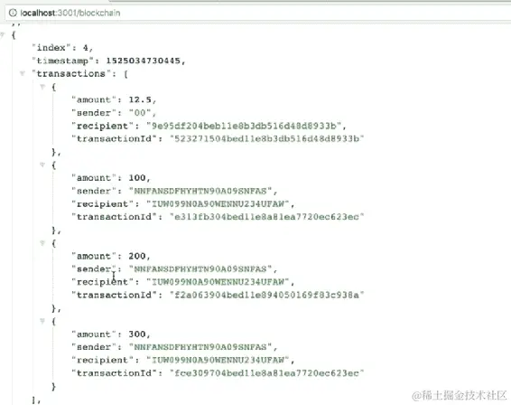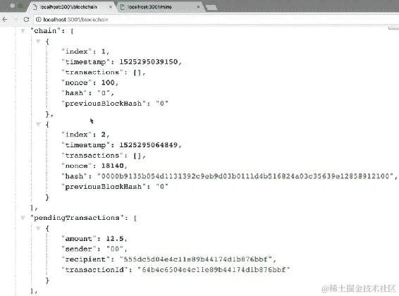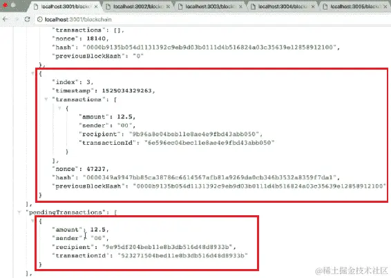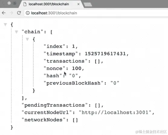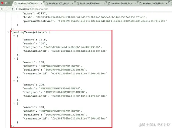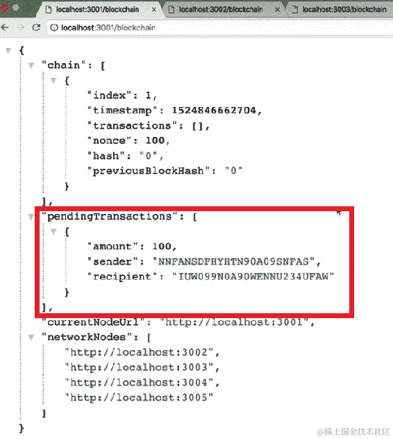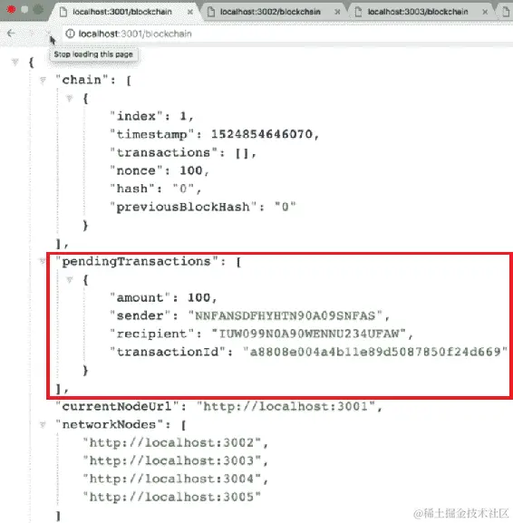 通过单击“发送”按钮将此交易发送到托管在localhost:3001上的节点。此交易将出现在localhost:3001/blockchain的pendingTransactions数组中,您可以在以下截图中观察到:
