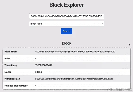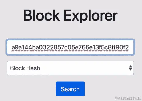 在添加数据之后,我们现在可以测试区块浏览器。让我们首先通过搜索块哈希来获取一个块。让我们选择“块哈希”选项: