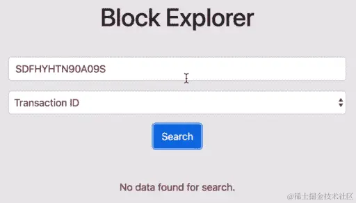 然后点击搜索,如果指定的数据存在于区块链中,将显示一个表格,其中将显示所有这些数据。如果我们的区块链上不存在数据,您将得到未找到数据的结果。这就是区块浏览器前端的工作原理。
