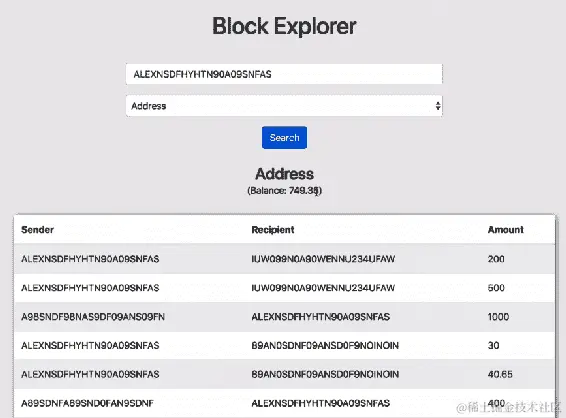 - 最后,测试地址端点。要做到这一点,从区块浏览器中选择地址选项,然后输入任何一个区块中的发件人或收件人地址。然后点击搜索按钮。您应该在屏幕上看到以下输出: