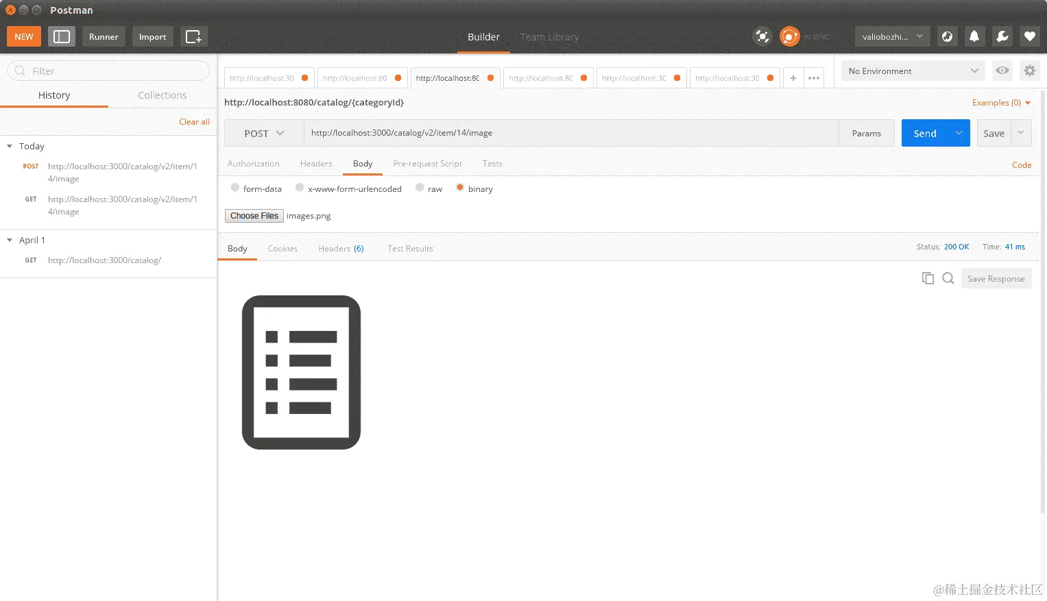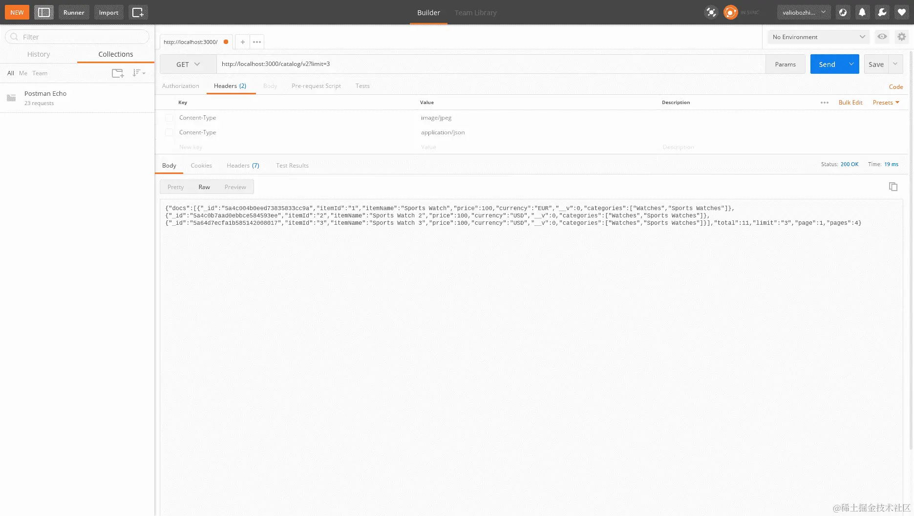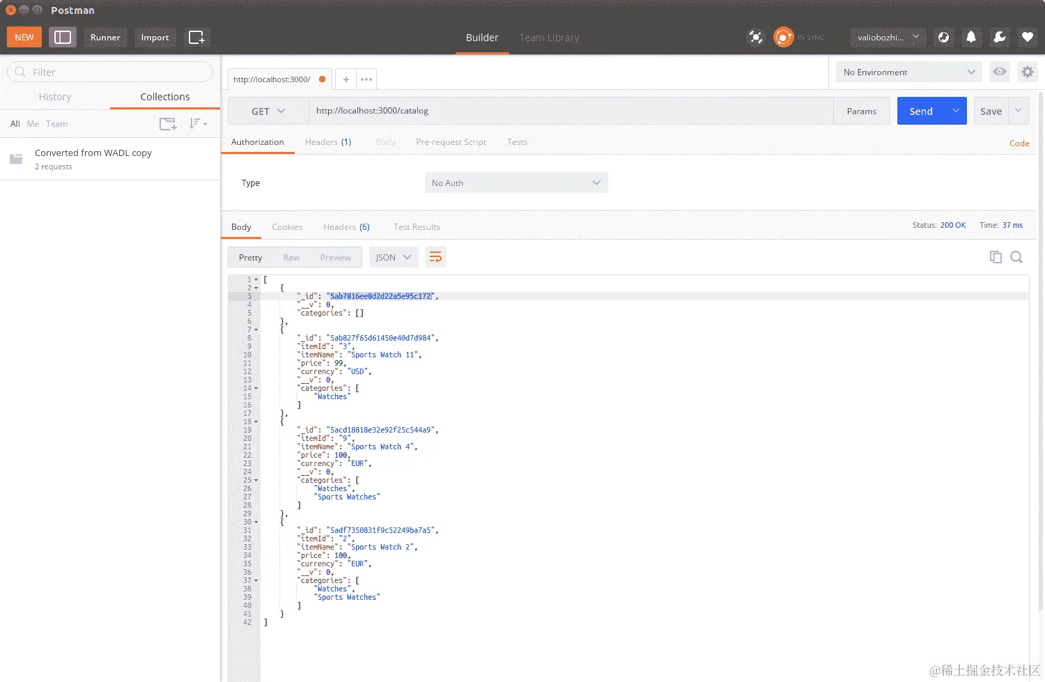 继续尝试吧!启动修改后的节点应用程序,并从 Postman 向http://localhost:3000/catalog发出 GET 请求: