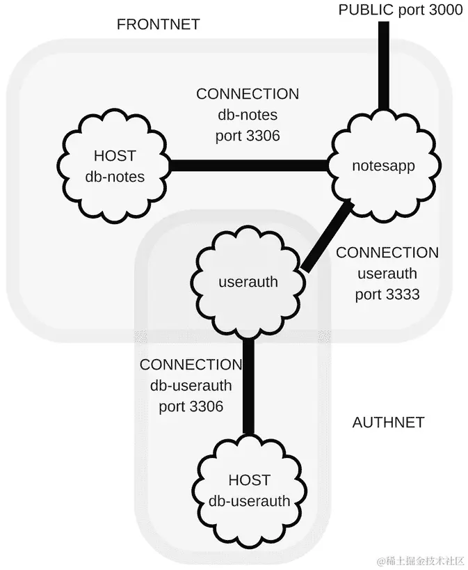 增强安全性的一种策略是尽可能少地暴露端口。这减少了所谓的攻击面,简化了我们在加固应用程序防止安全漏洞方面的工作。对于 Notes 应用程序,我们只需要暴露一个端口:用户访问应用程序的 HTTP 服务。其他端口——两个用于 MySQL 服务器,一个用于用户认证服务端口——不应该对公共互联网可见,因为它们仅供内部使用。因此,在最终系统中,我们应该安排暴露一个 HTTP 端口,并将其他所有内容与公共互联网隔离开来。