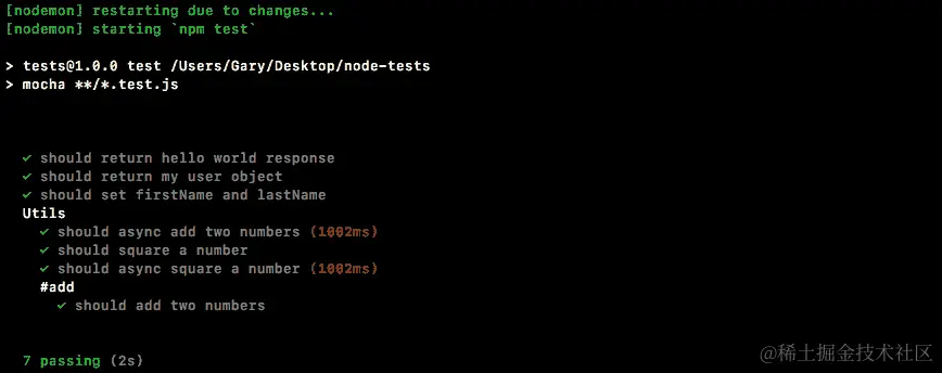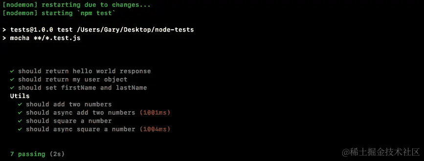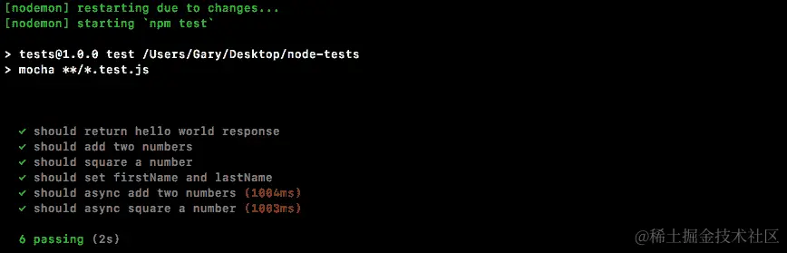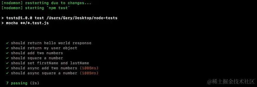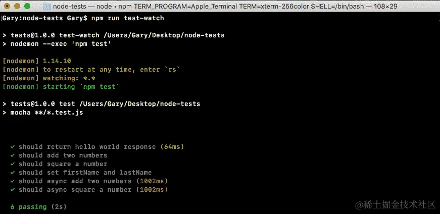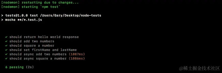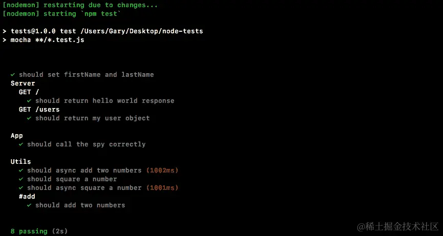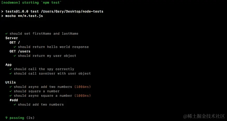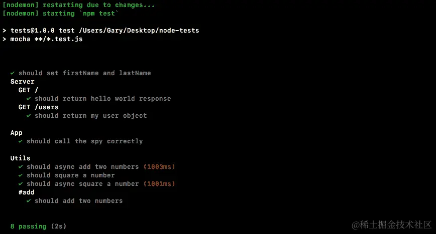 如果spy被调用,这将导致测试通过,如果spy从未被调用,这将导致测试失败。我们可以使用npm run test-watch命令在终端中运行测试套件,这将使用nodemon启动测试: