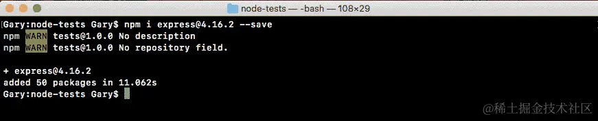 我们将从安装 Express 开始。我们将使用npm i,这是安装的缩写,来安装 Express。记住,你总是可以用i替换install。我们将获取最新版本@4.16.2。现在,我们将使用save标志,而不是我们在上一章中用于测试的save dev标志: