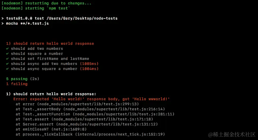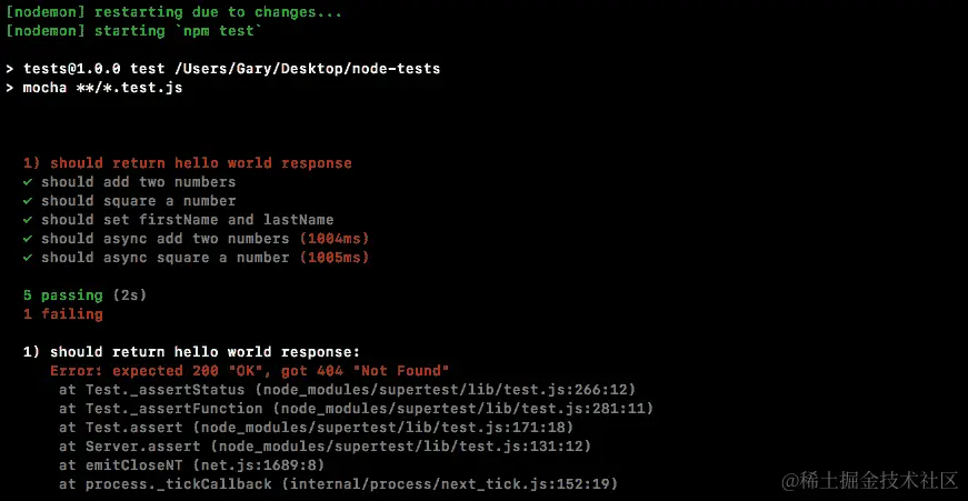 这应该导致 SuperTest 测试失败,确实如此: