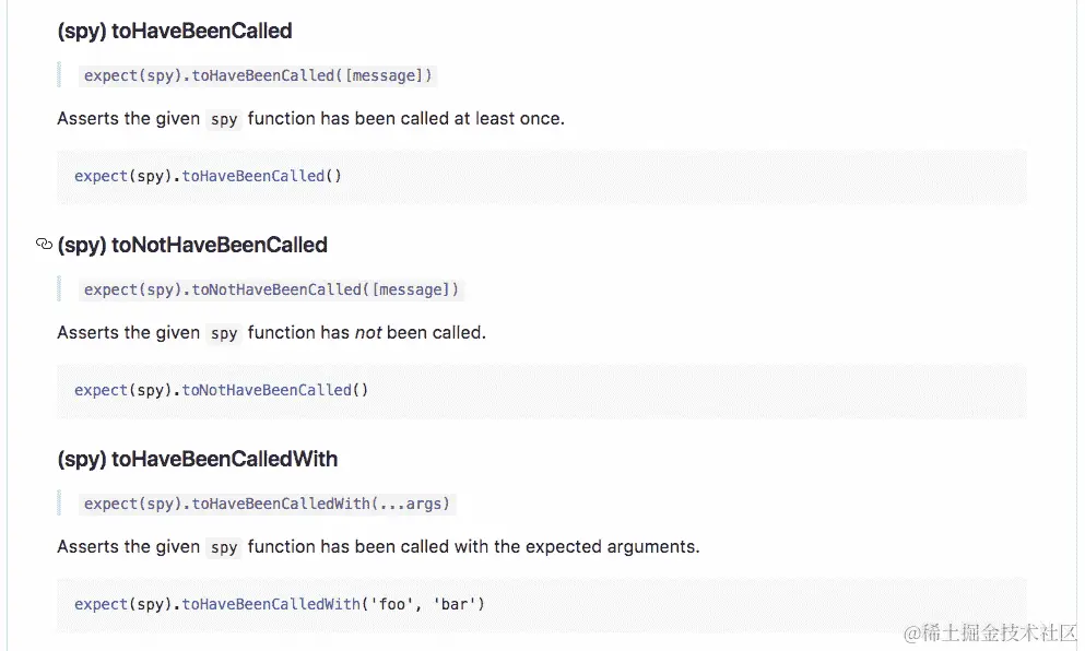 在这个页面上,我们可以向下滚动到间谍部分,他们在那里谈论我们可以访问的所有断言。我们应该开始在方法名称中看到间谍,这时我们就知道我们已经到达那里了: