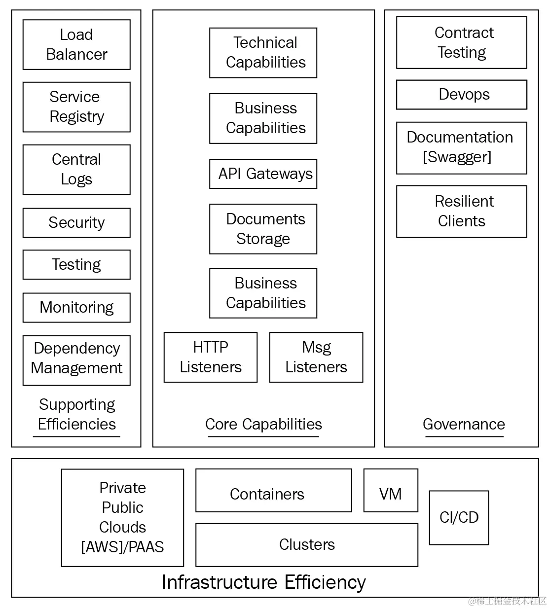 技术能力:任何需要的技术功能,如与服务注册表交互,向事件队列发送事件,处理事件等,都涉及在这里。