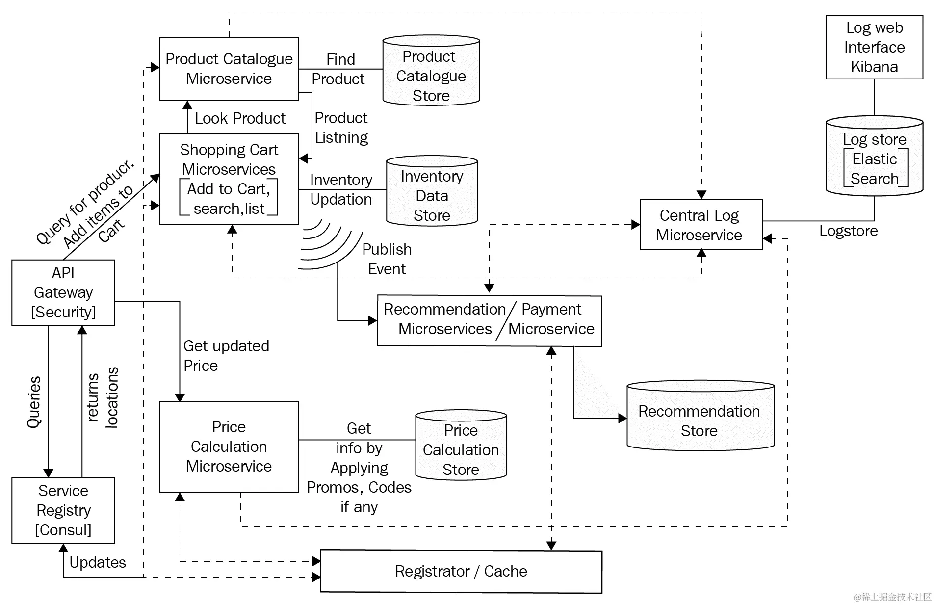 根据我们的业务能力和单一责任,我们将我们的微服务简要地划分为各种较小的应用程序。在我们的设计中,我们确保每个业务能力由一个单独的微服务实现,我们不会将一个微服务过载超过一个微服务。我们将整个系统简要地划分为各种微服务,如购物车微服务、产品微服务、支付微服务、消费者微服务、缓存微服务、价格计算和建议微服务等。整体的细粒度流程可以在前面的图表中看到。另一个重要的事情是,每个微服务都有自己的数据存储。不同的业务能力有不同的需求。例如,当一个人结账时,如果交易失败,那么所有的交易,比如将产品添加到客户的购买项目中,从产品库存中扣除数量等,都应该被回滚。在这种情况下,我们需要能够处理事务的关系型数据库,而在产品的情况下,我们的元数据不断变化。一些产品可能比其他产品具有更多的功能。在这种情况下,拥有固定的关系模式是不明智的,我们可以选择 NoSQL 数据存储。