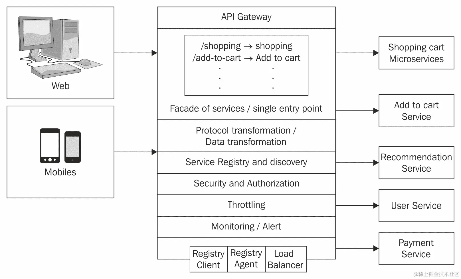 API 网关:终端客户端的通信单一点。API 网关是处理任何核心关注点的单一位置。