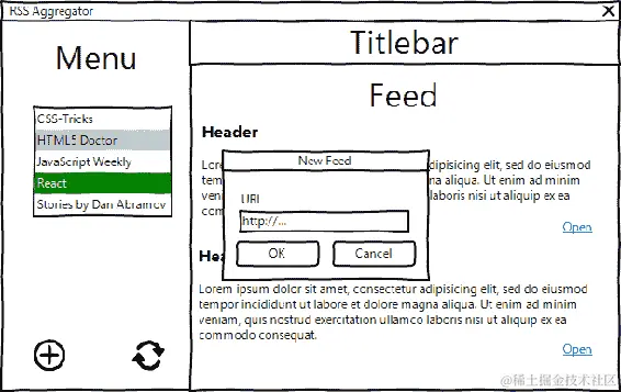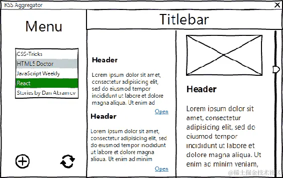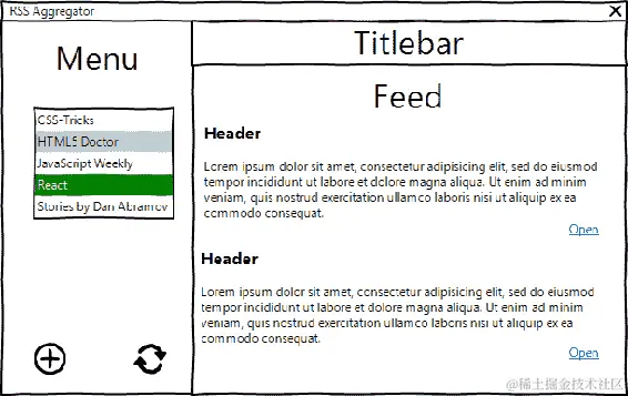 我们的Menu组件将包含聚合源的列表。用户可以使用add和remove按钮来管理列表。autorenew按钮用于更新所有源。