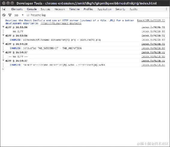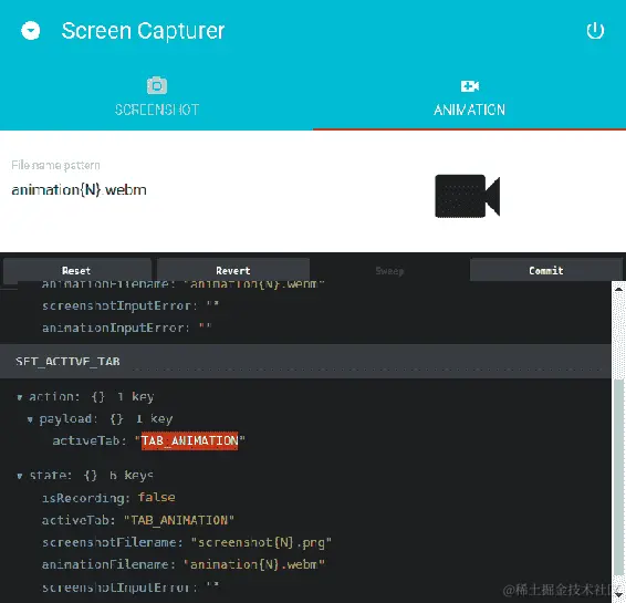 通过 redux-diff-logger 中间件,我们在 DevTools 的 JavaScript 控制台中收到报告,当我们执行任何导致状态更改的操作时。例如,我们修改了截图文件名模板,这立即反映在控制台中。实际上,我们收到了一个全新的状态树对象,但 redux-diff-logger 足够聪明,只显示我们真正感兴趣的内容 - 状态的差异。