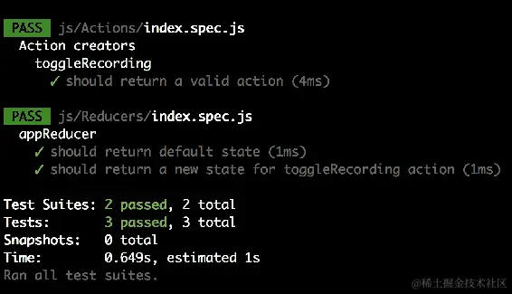 减速器和动作创建者都是纯函数。它们接受最后的状态树对象和分派的动作作为参数,并产生一个新的状态树对象。因此,在测试减速器时,我们正在检查给定的动作是否按预期修改了状态: