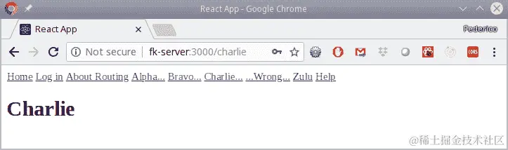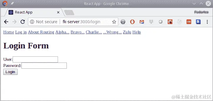 现在,如果我们打开应用程序并尝试访问普通的未受保护路由,一切都会像以前一样工作。但是,如果您尝试访问一些受保护的路由,比如"/charlie",您将被重定向到登录页面,如下截图所示: