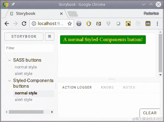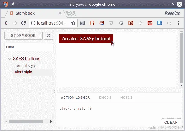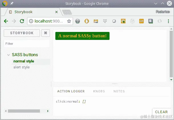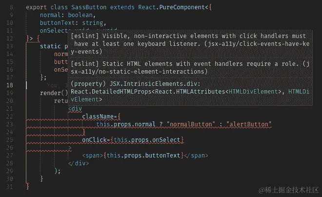 首先是按钮本身的代码,我们将其称为SassButton。它有三个 props:normal(如果为 true,将显示normal颜色;如果为 false,将显示alert颜色);buttonText,按钮上将显示的文本;以及onSelect,一个点击的回调。我在下面的代码片段中突出显示了与 CSS 相关的行。