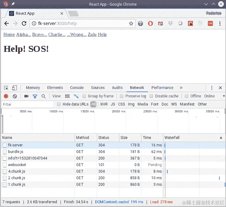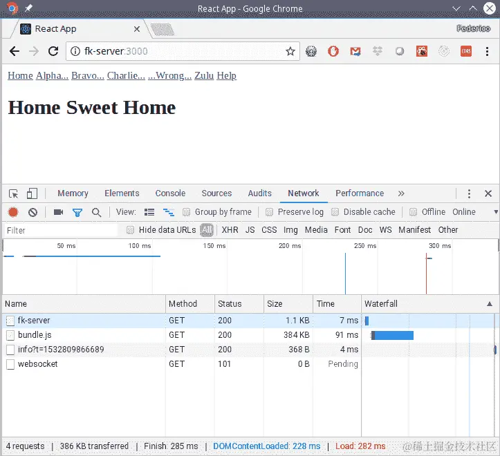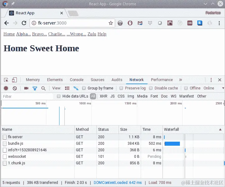 我们将使用 Web 开发人员工具来查看网络传输。当我们启动应用程序时,我们会得到主页和一些传输,包括bundle.js,主要源代码块。随着应用程序规模的增大,这个文件的大小将大幅增加。请参阅以下截图: