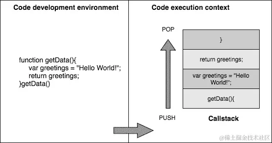 单线程模型在执行上下文中创建一个单一的调用栈。在前面的代码中,当函数getData()被调用时,该函数被推入堆栈以便按顺序执行。