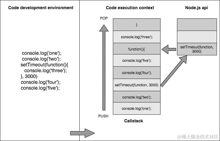 在前面的情况下,setTimeout()方法由 JavaScript(Node.js)API 提供。因此,这个方法被认为是同步的,并在不同的执行上下文中执行。根据setTimeout()的功能,它在指定的持续时间后执行回调函数,在我们的例子中是三秒后。