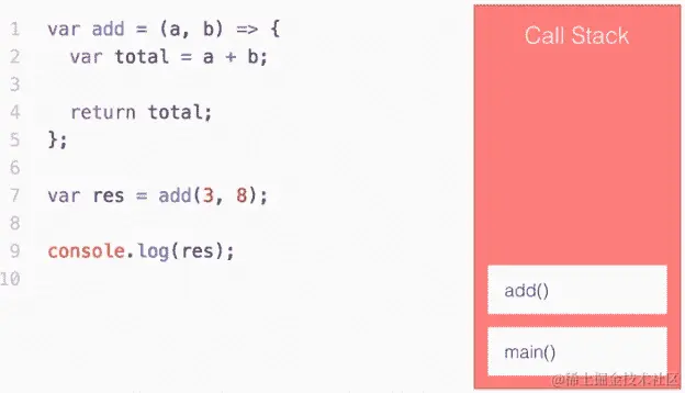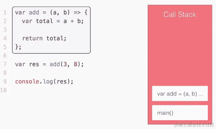 在这个例子中,我们将调用一个函数。所以我们将add()添加到调用堆栈上,并开始执行该函数:
