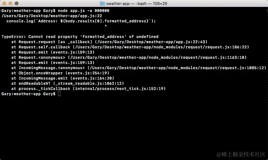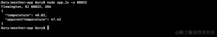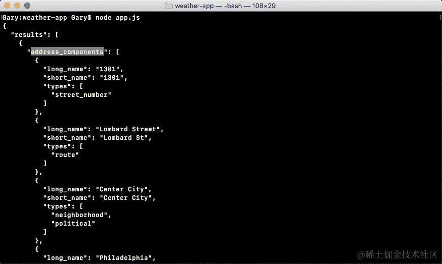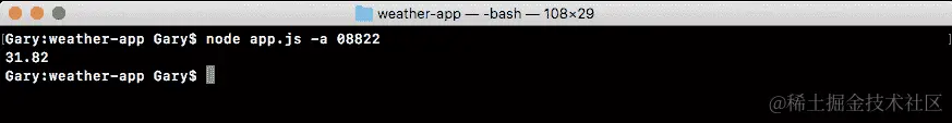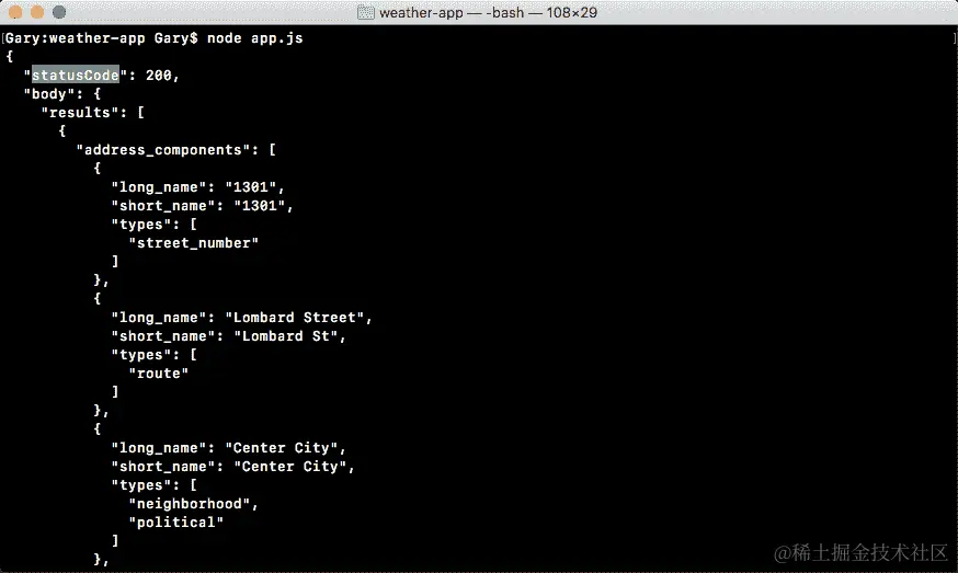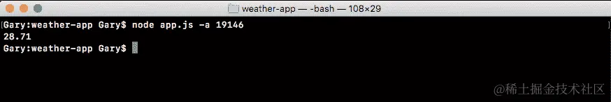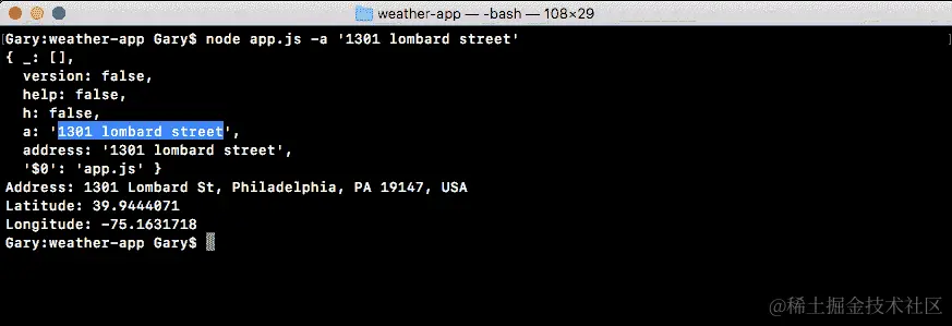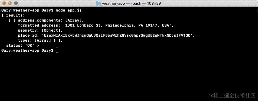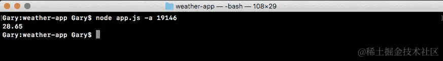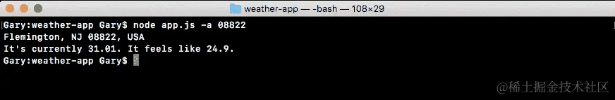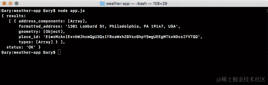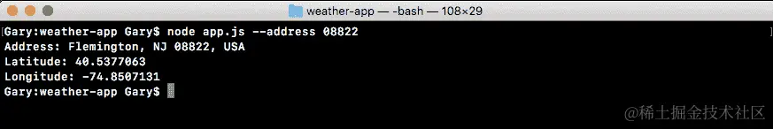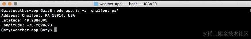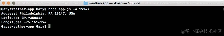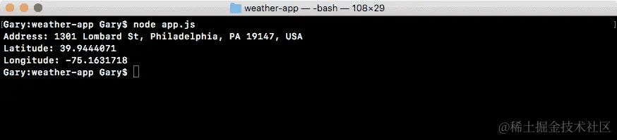 这就是我们需要做的一切,将数据从geocodeAddress传递给getWeather。这将创建一个在终端中打印我们动态天气的应用程序。